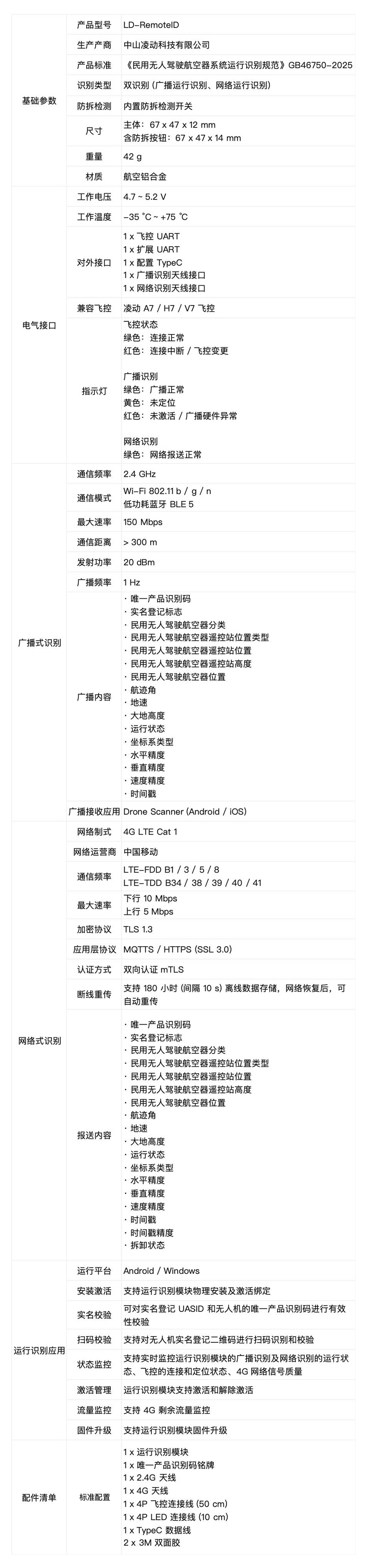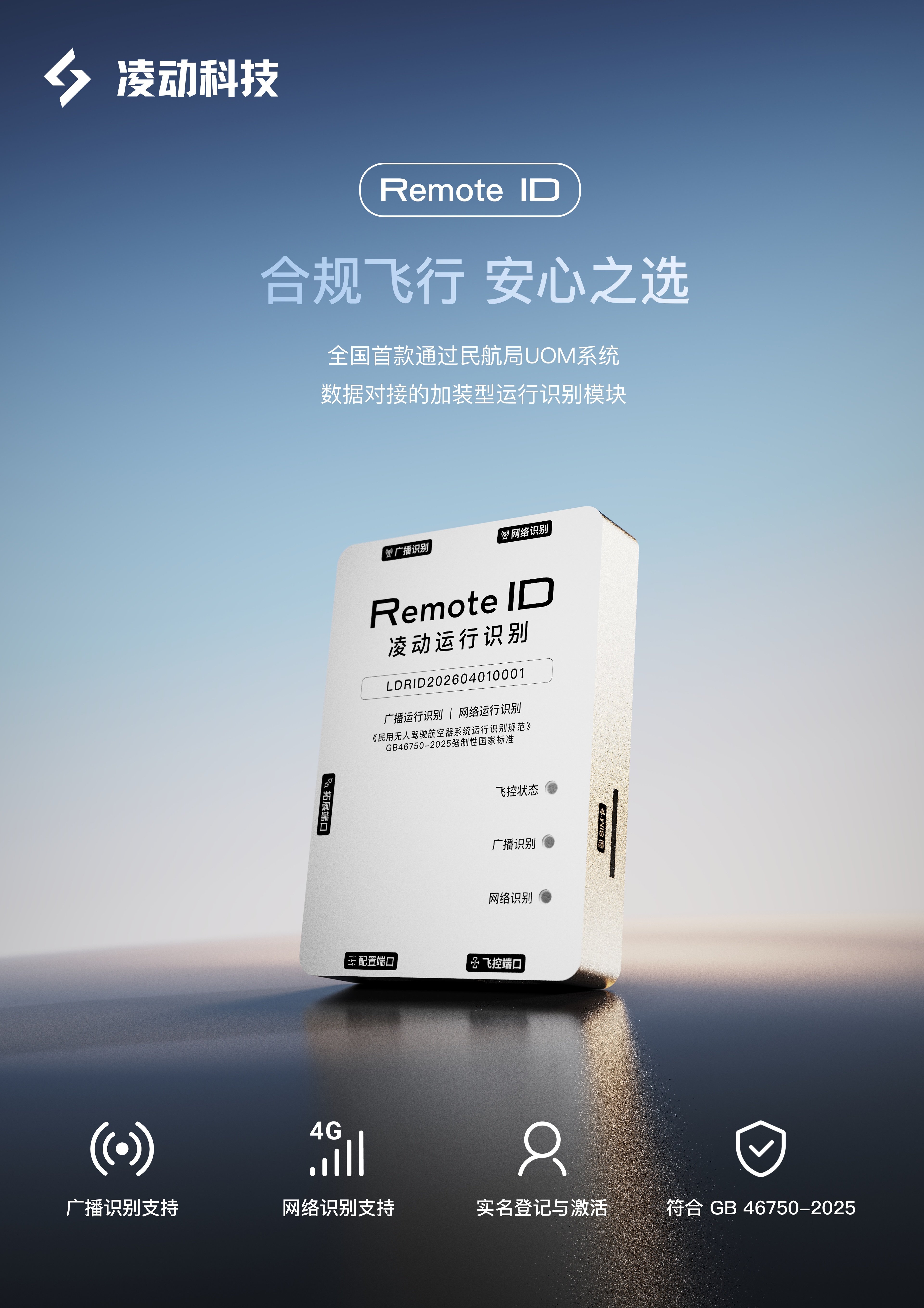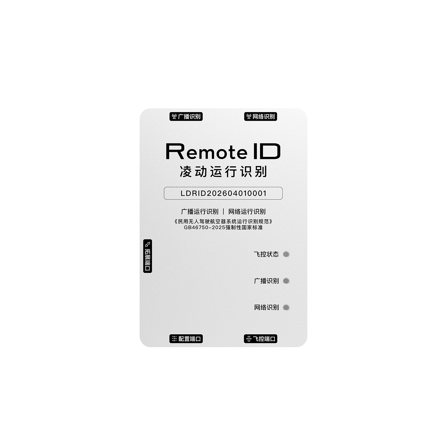 根据 GB 46750-2025 《民用无人驾驶航空器系统运行识别规范》要求,无人机应同时具备广播式和网络式运行识别发送功能。自 2026 年 5 月 1 日起,所有新生产的无人机出厂时应具备运行识别功能,而存量无人机应通过加装的形式增加运行识别能力。凌动运行识别模块严格遵循 GB 46750-2025 的标准研发生产,已通过民航局 UOM 系统数据对接和审核工作。